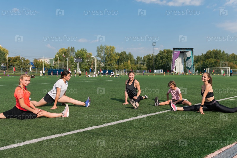 Тренер-женщина и группа детей проводят тренировку на стадионе