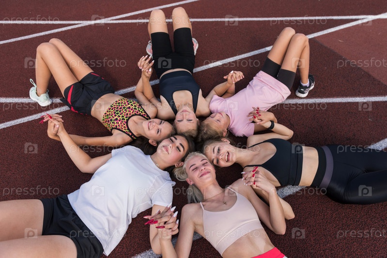 Группа девушек отдыхает на полу на стадионе