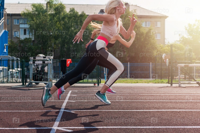 Две спортсменки-бегунки тренируются на стадионе на открытом воздухе