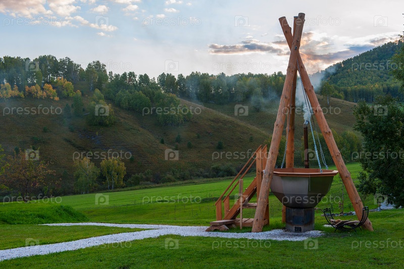 Большой резервуар с горячей водой и заваренными травами для купания, спа и отдыха. На открытом воздухе в горах Алтая, Сибирь, Россия