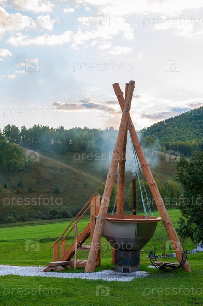 Большой резервуар с горячей водой и заваренными травами для купания, спа и отдыха. На открытом воздухе в горах Алтая, Сибирь, Россия