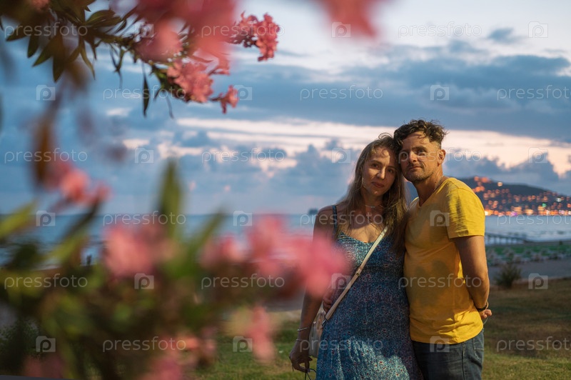 Счастливая пара фотографируется на пляже