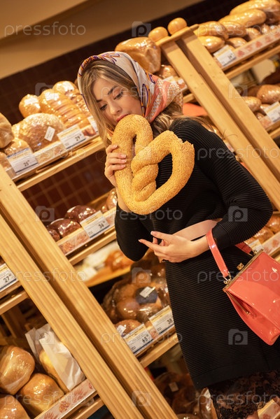 Молодая красивая женщина в хлебном отделе супермаркета