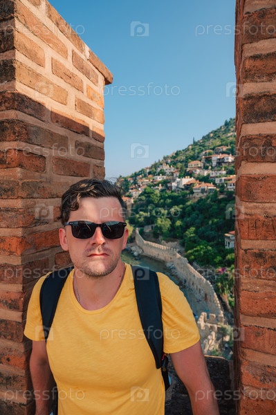 Мужчина у руин крепости исторической Красной башни - Кызыл Куле, в замке Алании, известном туристическом месте