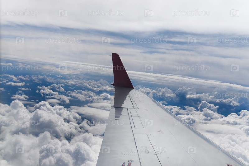 Коммерческий самолет во время полета против ясного голубого неба в движении с копировальным пространством. Глядя в окно самолета