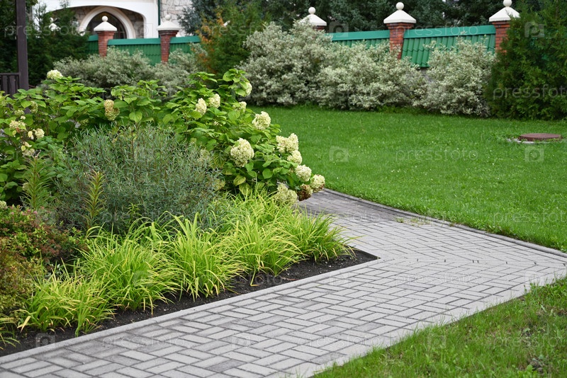 Красивый формальный сад с обеденной зоной, столом-тандыром на фоне белого куста гортензии