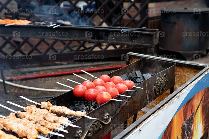 Вкусный процесс приготовления шашлыка. Мясо на гриле