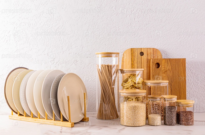 Набор стеклянных баночек с бамбуковой крышкой для хранения сыпучих продуктов стоит в ряд рядом со стойкой с деревянными кухонными инструментами. пластинчатая сушилка. Передний план