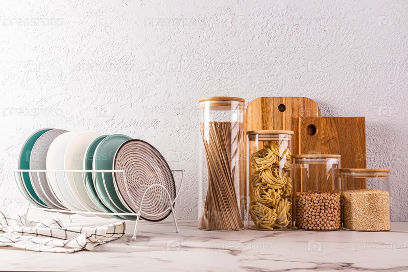 Набор экологичной посуды, тарелки в сушилке, стеклянные банки с сухим кормом на каменной столешнице. Передний план. Копия помещения