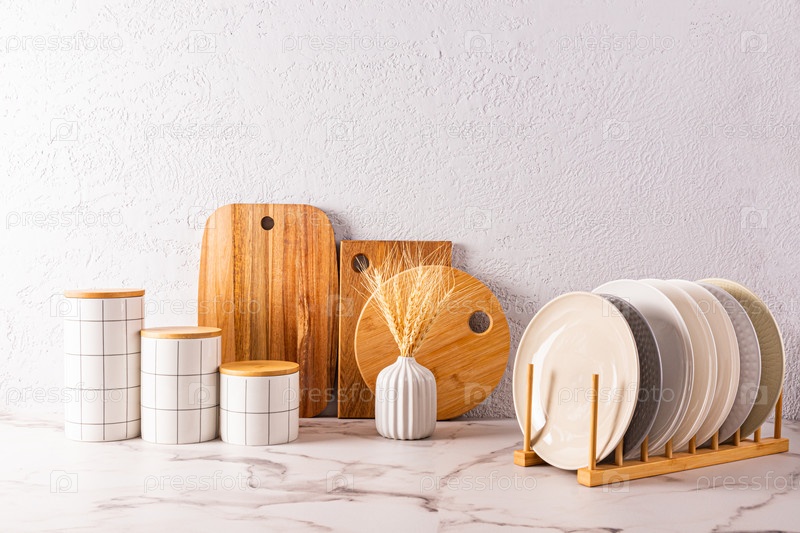 Экологичная посуда, керамические банки для хранения продуктов, сушилка для тарелок на мраморной столешнице. Безотходная кухня. Передний план