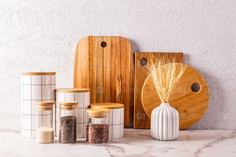 Набор керамических белых банок для хранения продуктов, стеклянных баночек для специй, набор деревянных разделочных досок на мраморной столешнице. кухонный фон