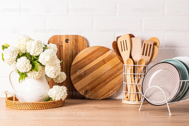Красивый кухонный фон с кухонной утварью и экологически чистой посудой на деревянной столешнице с кувшином белых весенних цветущих ветвей
