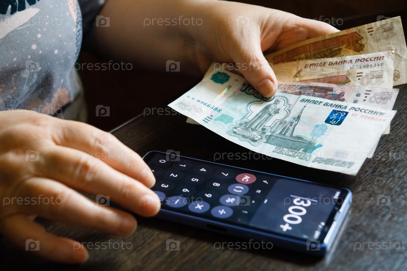 Пенсионерка держит в своих руках деньги и пересчитывает их на калькуляторе.Москва, Россия, 9 июня 2024 года