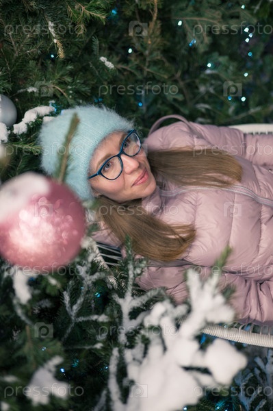 Красивая женщина с елкой. Рождественские праздники, Новый год или Рождество