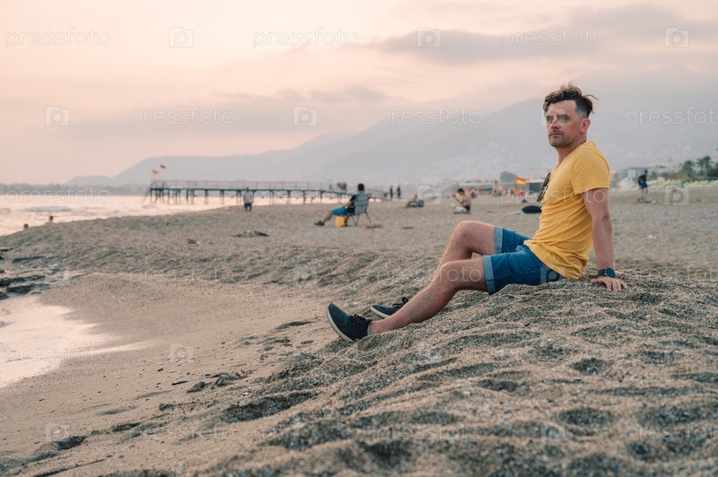 Мужчина сидит на пляже и смотрит на море в городе Алания, Турция. Концепция путешествия или отпуска