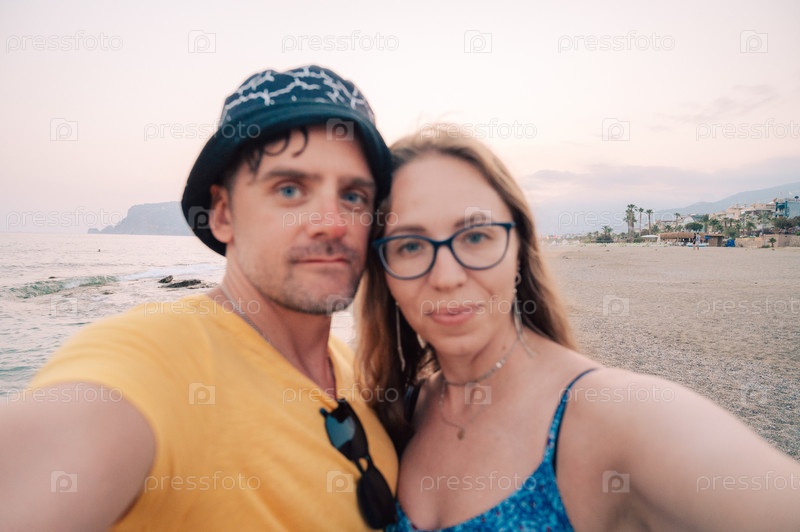 Счастливая пара фотографируется на пляже