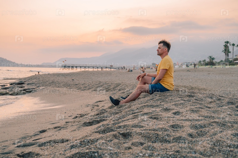 Мужчина сидит на пляже и смотрит на море в городе Алания, Турция. Концепция путешествия или отпуска