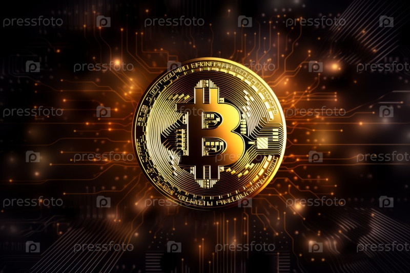 Золотой биткойн на темном цифровом фоне, концепция криптовалюты