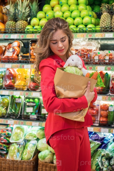Молодая красивая женщина со своим домашним белым кроликом в супермаркете