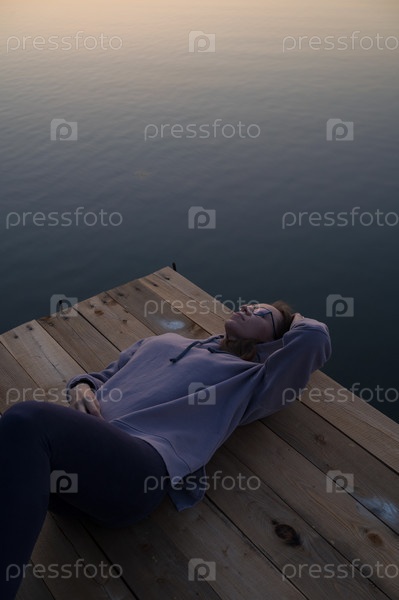 Женщина лежит на пирсе у озера, портрет крупным планом, летний закат