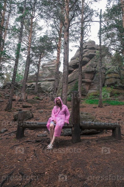 Женщина в плаще в тайге и скалах заповедника Столбы, Красноярск, Россия