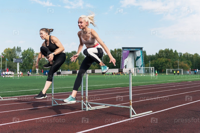 Две спортсменки-бегуны бегут с препятствиями