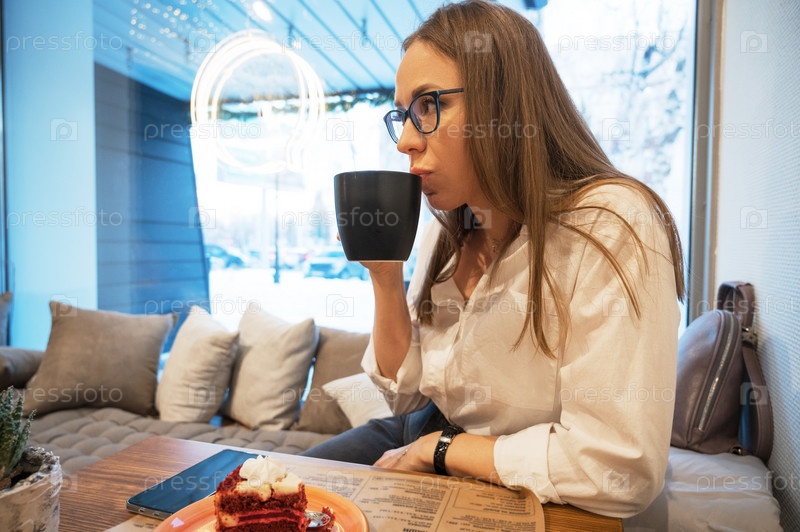 Молодая женщина пьет кофе в кафе