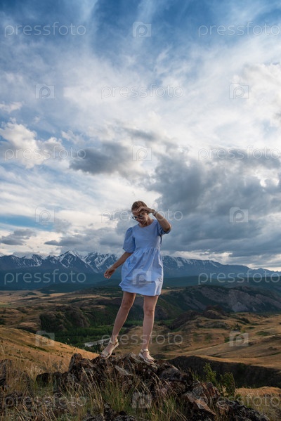 Женщина в синем платье в летних горах Алтая