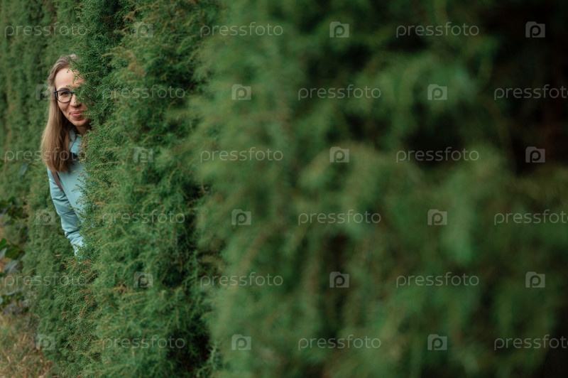 Осенний портрет красивой женщины на фоне природы туи