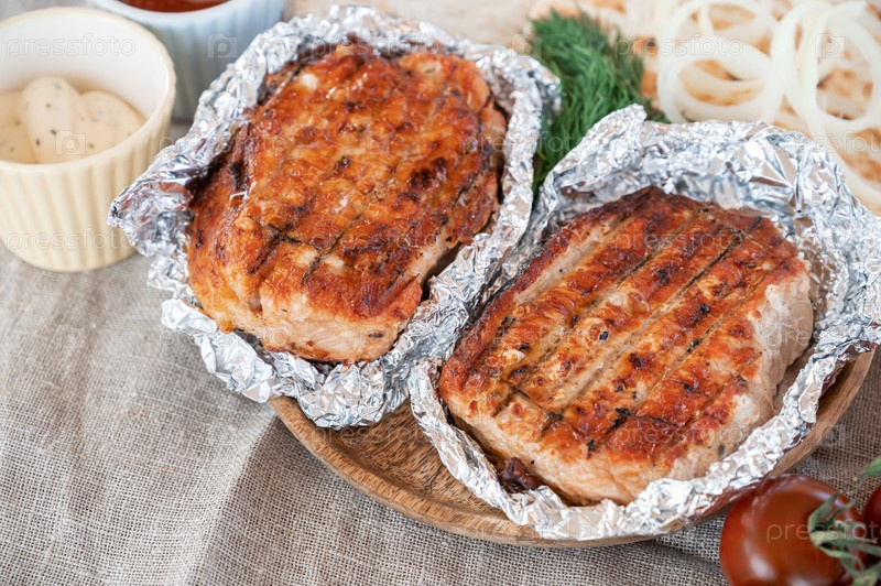 Жареная свинина в фольге с оладьями и овощами. Концепция летнего отдыха