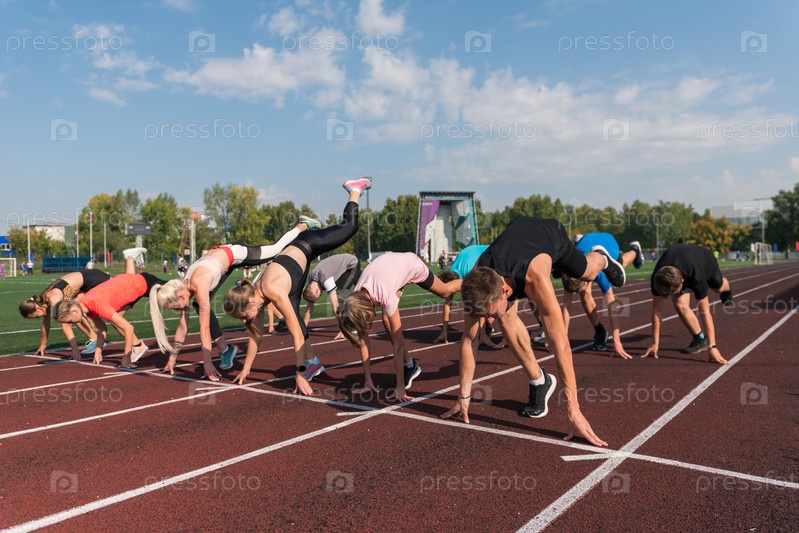 Группа молодых спортсменов-бегунов тренируется