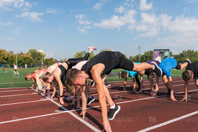 Группа молодых спортсменов-бегунов тренируется на стадионе на открытом воздухе