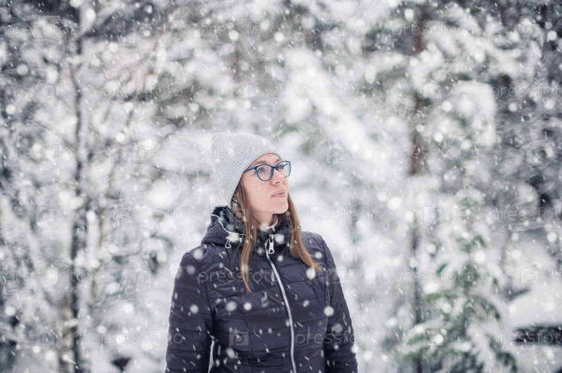 Женщина в зимней куртке гуляет по заснеженному зимнему лесу, снежный зимний день