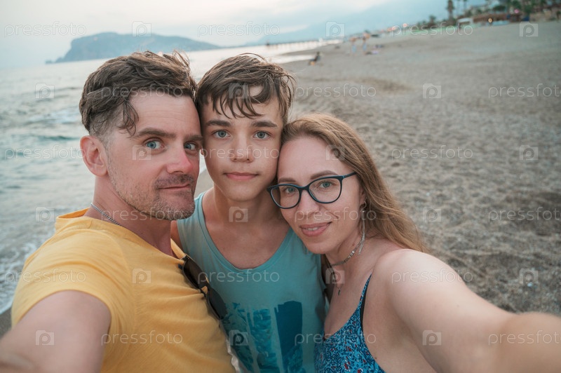 Счастливая семья фотографируется на пляже у моря в городе Алания, Турция. Концепция путешествия или отпуска