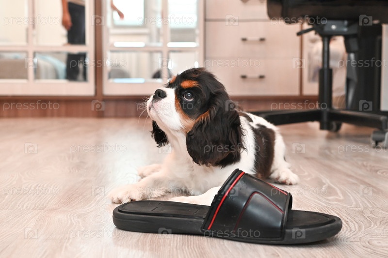 Милый щенок кавалер-кинг-чарльз-спаниеля учится вести себя дома