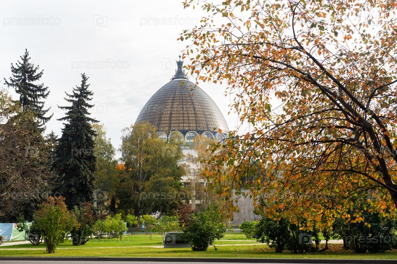 Москва, Россия - 08 ОКТЯБРЯ 2020 г.: Павильон Музея космонавтики в осеннем парке ВДНХ. Русская советская авиация космоса