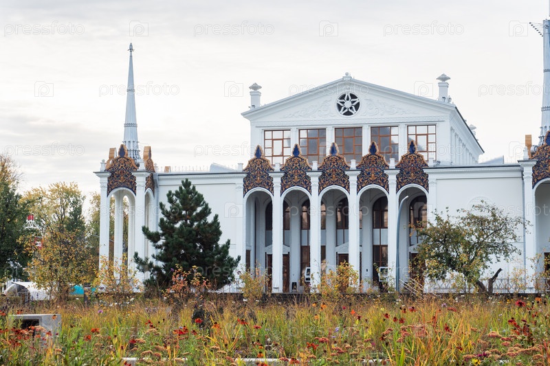Москва, Россия - 08 ОКТЯБРЯ 2020 г.: Осенний вид на павильон нефтяной промышленности на ВДНХ через Мичуринские сады