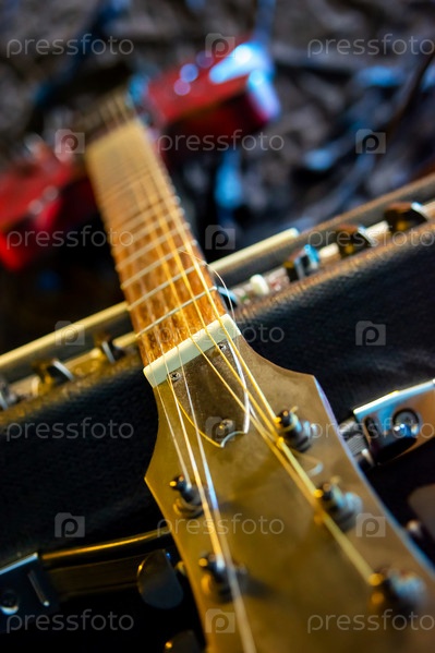 В центре внимания — электрогитара с отделкой в виде солнечных лучей на винтажном ламповом усилителе. Эффектное освещение подчеркивает дизайн полого корпуса гитары и твидовую обшивку усилителя