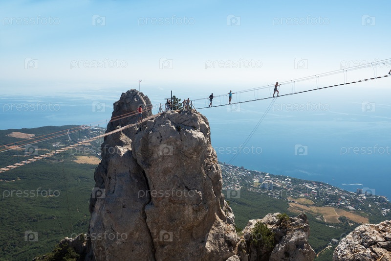 Ялта, Крым - 20 сентября 2020 года: Туристы идут по подвесному веревочному мосту на вершине горы Ай-Петри