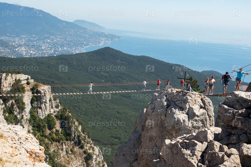Ялта, Крым - 20 сентября 2020 года: Туристы идут по подвесному веревочному мосту на вершине горы Ай-Петри
