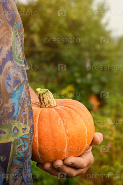 Мужчина держит желтую тыкву. Подготовка к Хэллоуину. Урожай тыквы. тыква в руках человека на фоне зелени