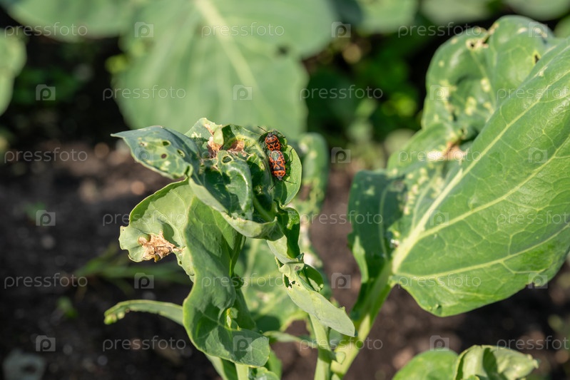 Листья цветной капусты, поврежденные жуком Pyrrocoris apterus на подстилке