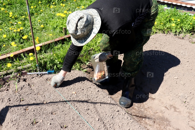 Пенсионер сажает репчатый лук, держа пакет с луковицами