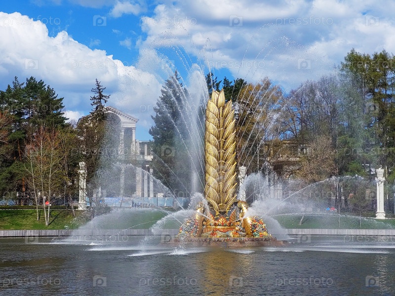Москва, Россия - 03 мая 2022 года: Фонтан Золотой Колос на ВДНХ весной