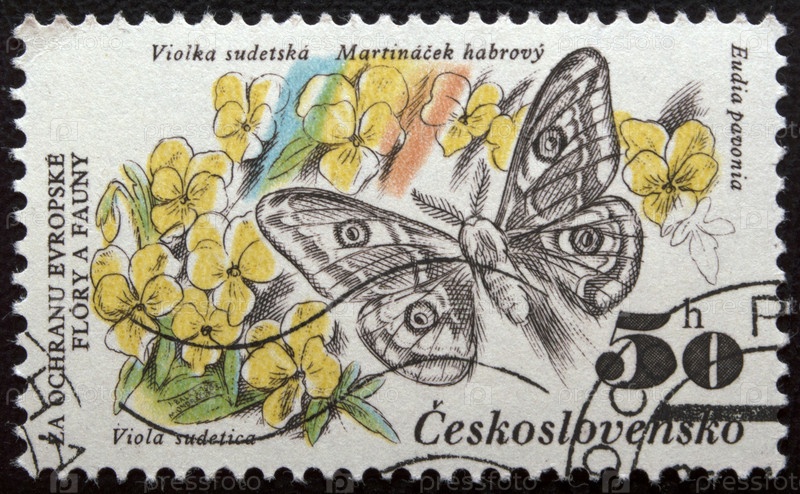 Почтовая марка Чехословакия 1983 год. Императорский мотылек и горные анютины глазки
