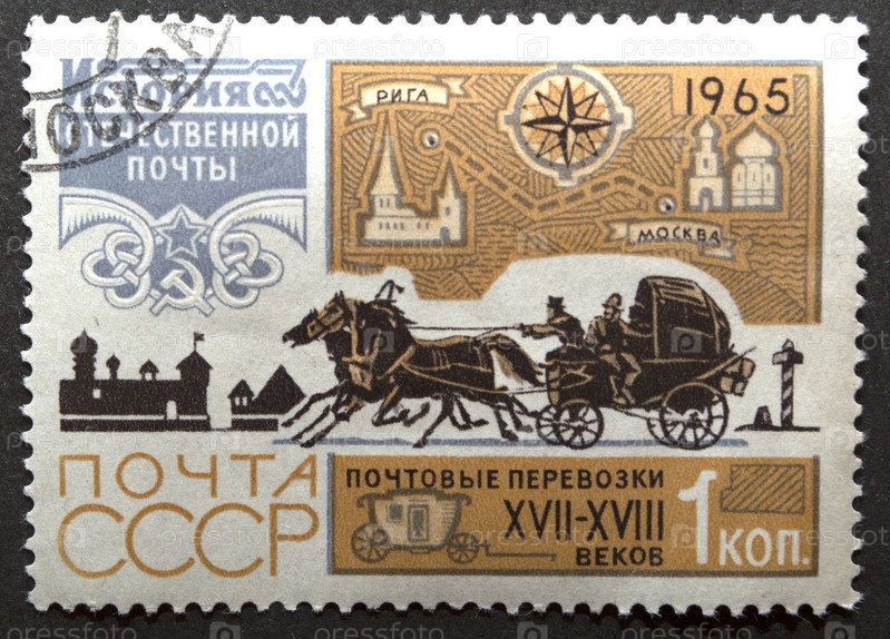 Почтовая марка СССР 1965 год Почтовые перевозки XVII-XVIII веков История отечественной почты Марка с отключением