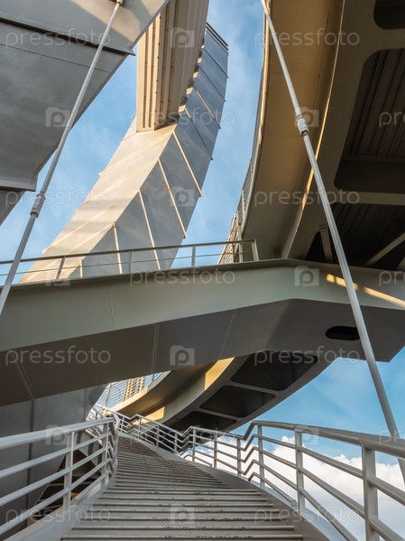 Геометрия плавных абстрактных линий архитектуры моста из стали в городе Санкт Петербурге утром на фоне синего неба