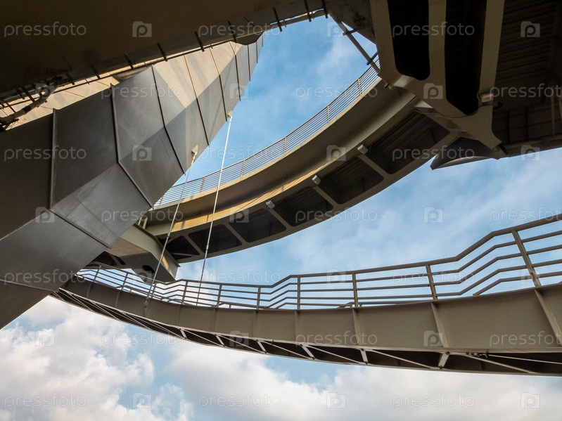 Геометрия плавных абстрактных линий архитектуры моста из стали в городе Санкт Петербурге утром на фоне синего неба