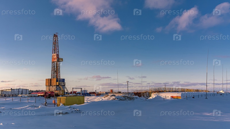 Инфраструктура буровой установки на арктическом нефтегазовом месторождении. Северная снежная зима. Полярный день. Голубое небо