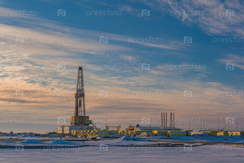 Инфраструктура буровой установки на арктическом нефтегазовом месторождении. На переднем плане вертолетная площадка. Полярный день. Облачное небо